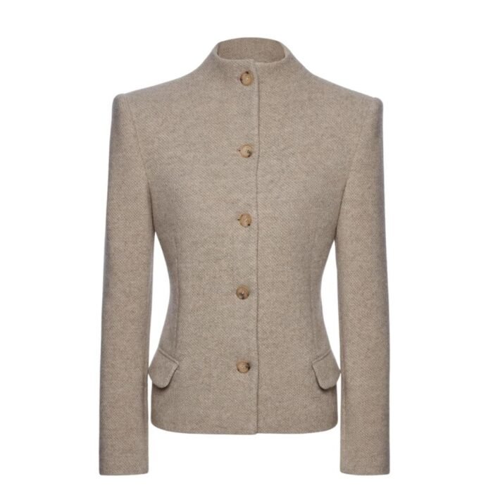 The collarless high neck adds a contemporary twist to the traditional blazer, lending a modern and sophisticated edge to the design. This chic neckline elongates the neck and frames the face, drawing attention to the wearer’s features and adding a touch of refinement to any ensemble. Its clean lines and minimalist aesthetic make it a versatile choice for both formal and casual occasions.
