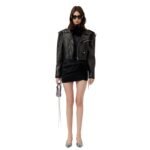 At the heart of the jacket lies its distinctive cropped silhouette, which offers a modern twist on the timeless biker aesthetic. This abbreviated length not only adds a sense of youthful exuberance but also allows for effortless layering, making it the perfect companion for both casual outings and evening soirées alike.