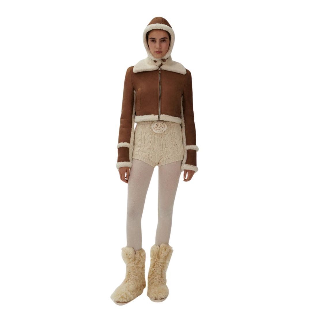 In a timeless beige hue, this cropped shearling jacket is a versatile wardrobe staple that transcends trends and seasons. Whether layered over a dress for a night out or paired with jeans and a sweater for a casual weekend look, it adds a touch of luxury and sophistication to any outfit.