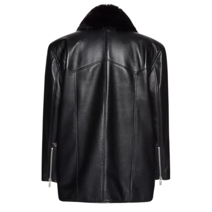 Adding a luxurious touch to the jacket is the faux fur collar and front lining. This plush material not only adds warmth and cosiness but also lends a wintery look to the leather piece. The contrast between the sleek leather and soft faux fur creates a striking visual contrast, elevating the jacket’s overall aesthetic and making it a standout piece in any wardrobe.