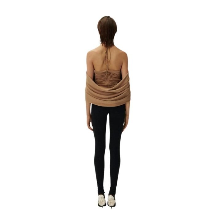 Magda Butrym Flower Applique wrap blouse in beige halterneck tube top is a stunning example of her distinctive design aesthetic, combining classic elegance with modern touches. This top features signature Magda detailing such as intricate ruching and a beautifully crafted floral appliqué, adding depth and texture to the garment.