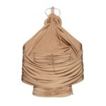 In summary, Magda Butrym’s jersey halterneck tube top combines classic elements with contemporary details to create a versatile and stylish piece. With ruching, a floral appliqué, and a unique wrap effect for an off-the-shoulder look, this top offers a blend of elegance and modernity, making it a must-have addition to any fashion-forward wardrobe.