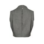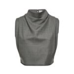 In summary, Magda Butrym’s high-neck technical blouse in grey is crafted from seasonal technical wool, inspired by men’s tailoring. Its lightweight, sleeveless design features a slightly draped high neckline, combining elegance with practicality. This versatile top is perfect for creating sophisticated and stylish looks, suitable for any occasion.