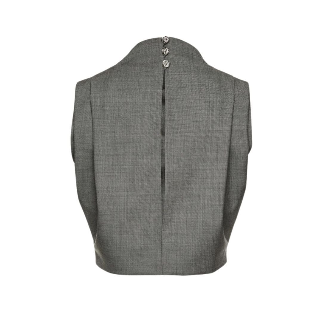 Magda Butrym high neck technical blouse in grey is a masterful blend of modern design and classic tailoring. Crafted from seasonal technical wool, this lightweight sleeveless top draws inspiration from men’s tailoring, showcasing a unique fusion of structure and sophistication.
