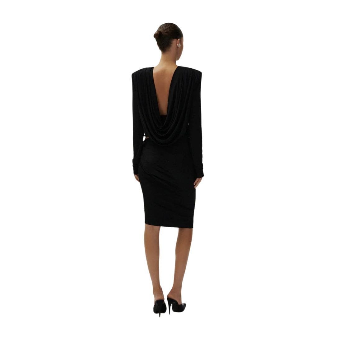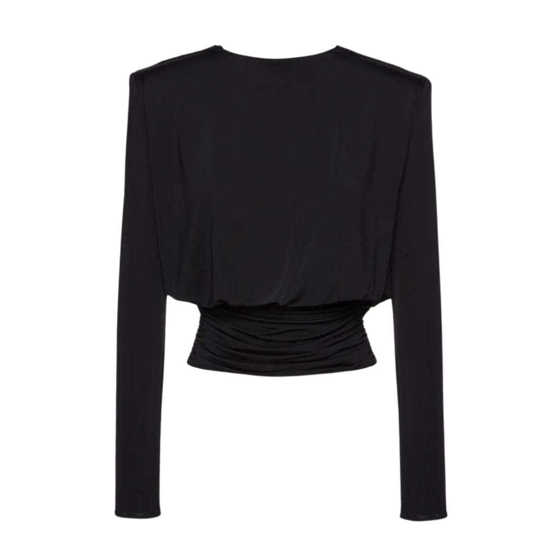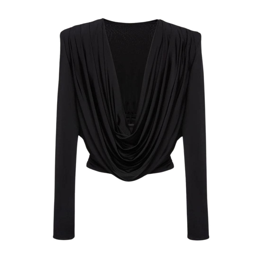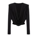 In summary, Magda Butrym’s black long sleeve draped jersey blouse is a versatile and stylish addition to any wardrobe. Its draped neckline, long sleeves, and removable shoulder pads offer a blend of comfort and sophistication, making it a go-to choice for chic and polished looks.