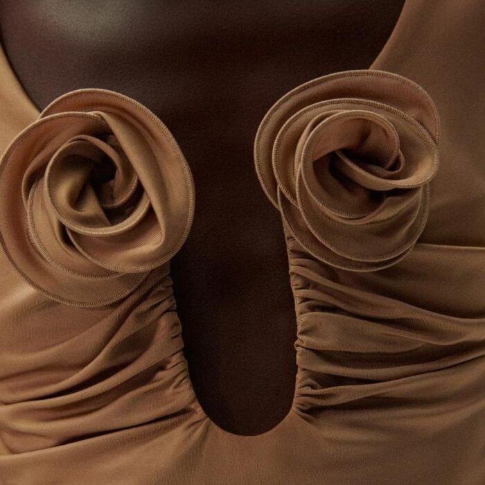 The 3D floral appliqués are meticulously crafted, showcasing Magda Butrym’s dedication to artisanal craftsmanship and attention to detail. The floral embellishments not only enhance the aesthetic appeal of the top but also lend a romantic and feminine charm to the overall design.