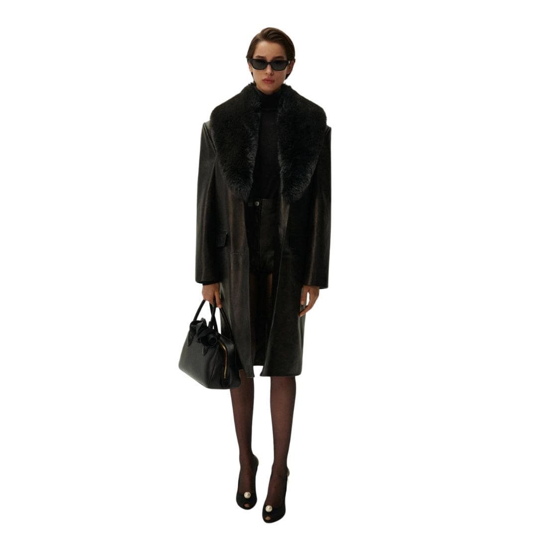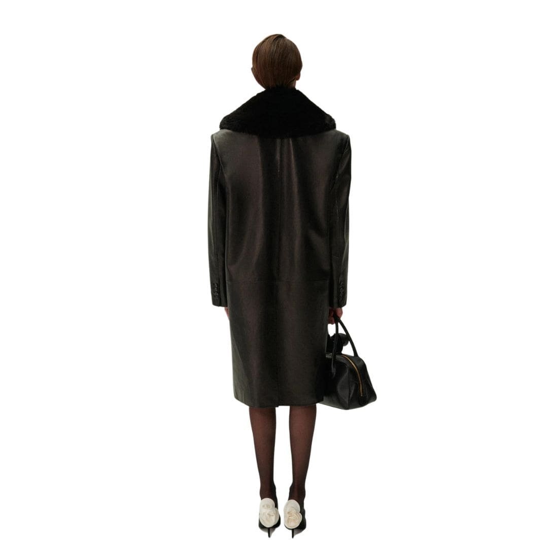 Introducing MAGDA BUTRYM OVERSIZED CLASSIC MIDI COAT IN BLACK LEATHER WITH FAUX FUR that seamlessly blends classic features with contemporary sophistication, embodying the timeless elegance synonymous with Magda Butrym’s signature style. Crafted with meticulous attention to detail, this coat is designed to evoke the brand’s iconic signatures, reminiscent of classic coats and tailored blazers.