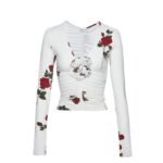 Magda Butrym Ruched V Neck long sleeve jersey top in White Print her signature rose print combines floral charm with contemporary flair. The top showcases a flattering V-neckline that transitions seamlessly into a centered ruching detail down the torso. This ruching not only enhances the silhouette but also adds texture and depth to the garment, making it a standout piece in any wardrobe.