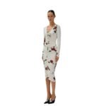 In essence, Magda Butrym’s rose print jersey sleeve with a V-neck and ruching detail is a timeless addition to any wardrobe. Its combination of floral elegance and contemporary design elements makes it a versatile and stylish choice for modern women who appreciate both comfort and fashion-forward aesthetics.
