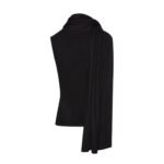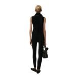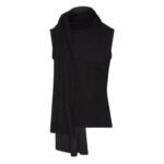 The blend of wool, silk, and cashmere brings together warmth, softness, and a lustrous sheen, making the top ideal for transitioning between seasons. The sleeveless design with a turtleneck collar offers a sophisticated silhouette, while the dramatic sash scarf detail adds a touch of flair and versatility. Whether draped loosely or tied creatively, the scarf detail allows for personalized styling, enhancing the top’s visual appeal.