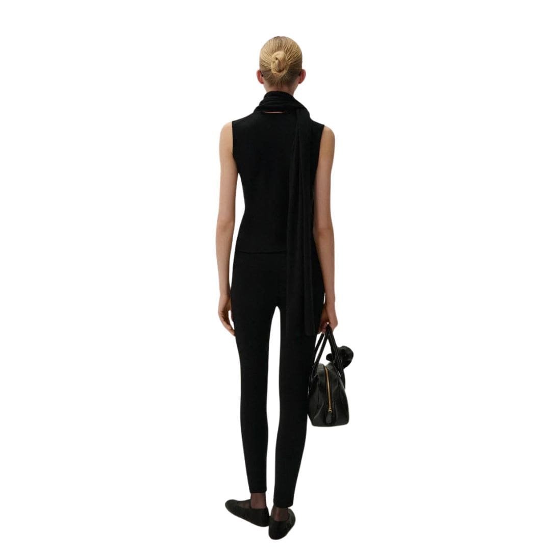 This sleeveless turtleneck top by Magda Butrym sleeveless high neck knit top in Black showcases a distinctive sash scarf detail, crafted from a luxurious blend of wool, silk, and cashmere. Made in Italy, it exemplifies fine craftsmanship and high-quality materials, ensuring both comfort and elegance.