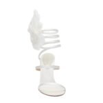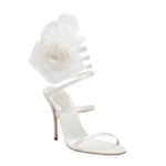 Introducing the latest creation from Magda Butrym: a captivating MAGDA BUTRYM SPIRAL SILK-ORGANZA FLOWER HEEL SANDALS IN CREAM that seamlessly blends modern design with timeless elegance. These sandals are distinguished by a mesmerizing feature—a strap that elegantly spirals up to the ankle, imparting a sense of movement and grace to the wearer’s stride.