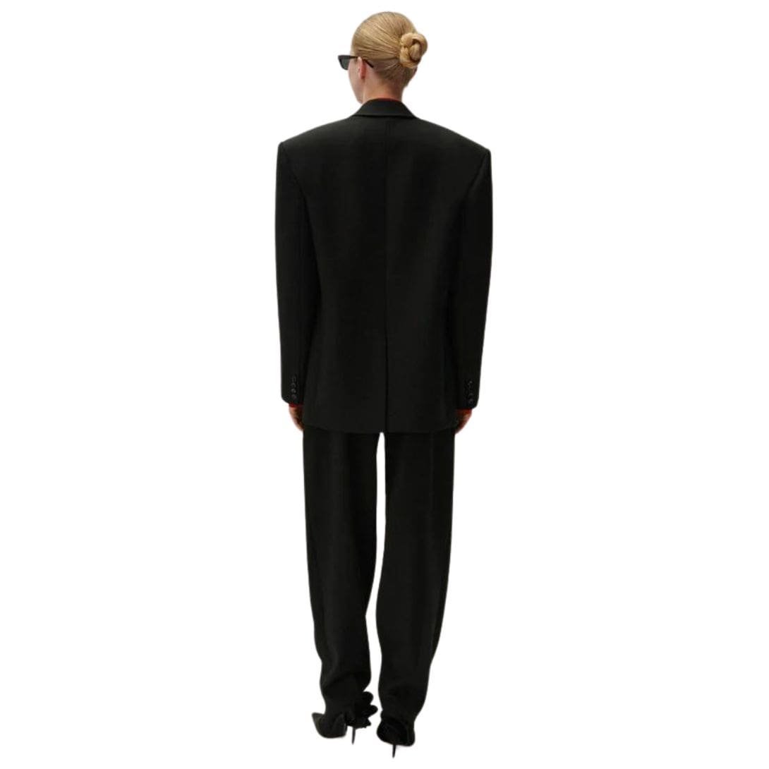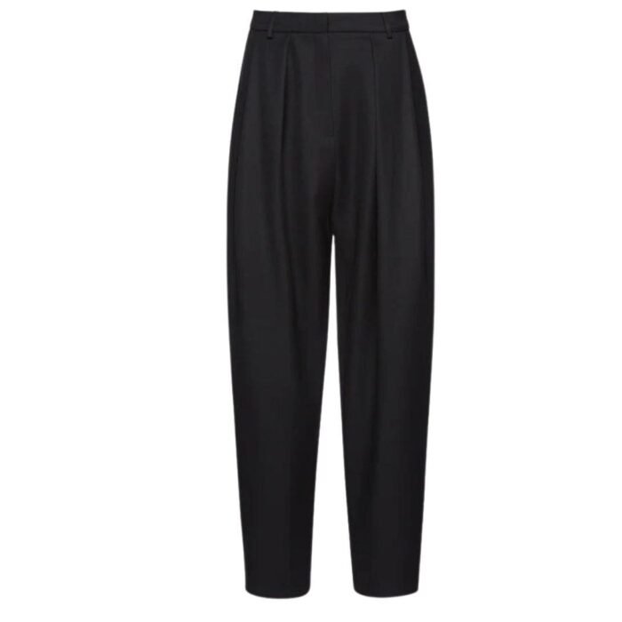 Magda Butrym Tapered Wool Trousers In Black. Pants are a masterclass in elegant tailoring, combining traditional design with a modern twist. These pants are designed to fit loosely at the hips and gradually narrow down the leg, creating a sleek and sophisticated silhouette. This season, the pants have been updated with an extra slouchy cut, adding a contemporary edge to this timeless piece.