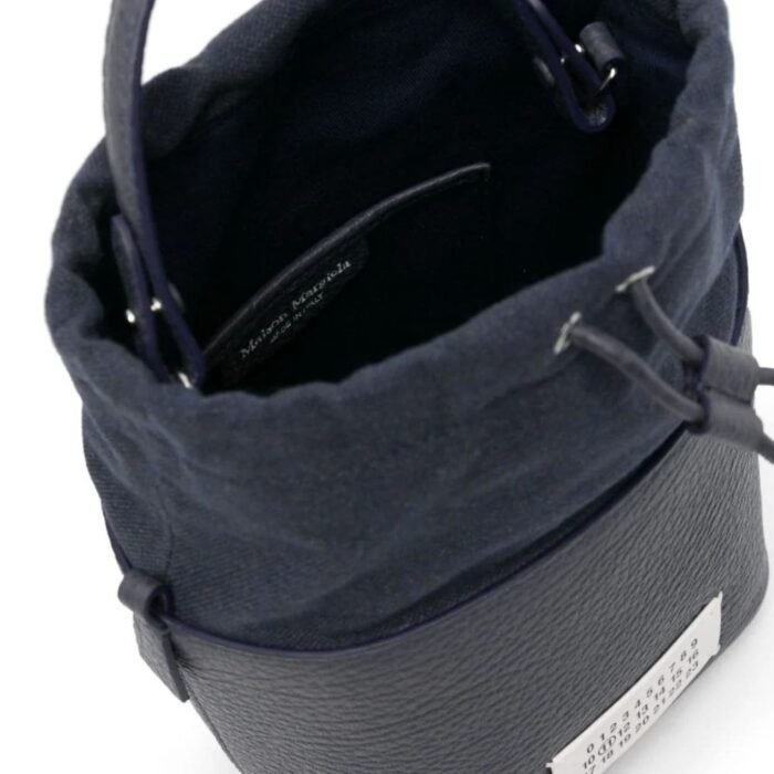 Maison Margiela 5AC logo-patch bucket bag Crafted with precision in Italy, this standout piece showcases a deep navy blue hue and is crafted from exquisite calf leather, featuring a distinct pebbled texture for added allure. The logo patch on the front, adorned with the signature numbers motif, adds a touch of sophistication.