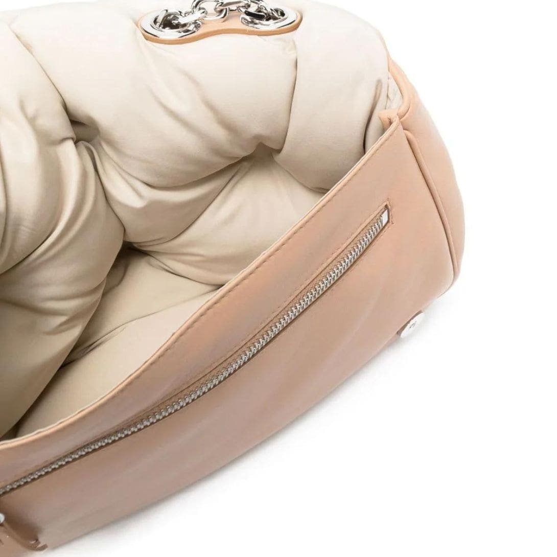 Equipped with silver-tone hardware, including a front zip-fastening pocket and a foldover top with a magnetic closure, this shoulder bag offers both style and functionality. Carry it effortlessly using the two chain-link top handles or the leather and chain-link shoulder strap, providing versatile options for every occasion.