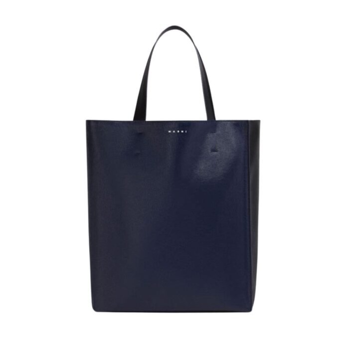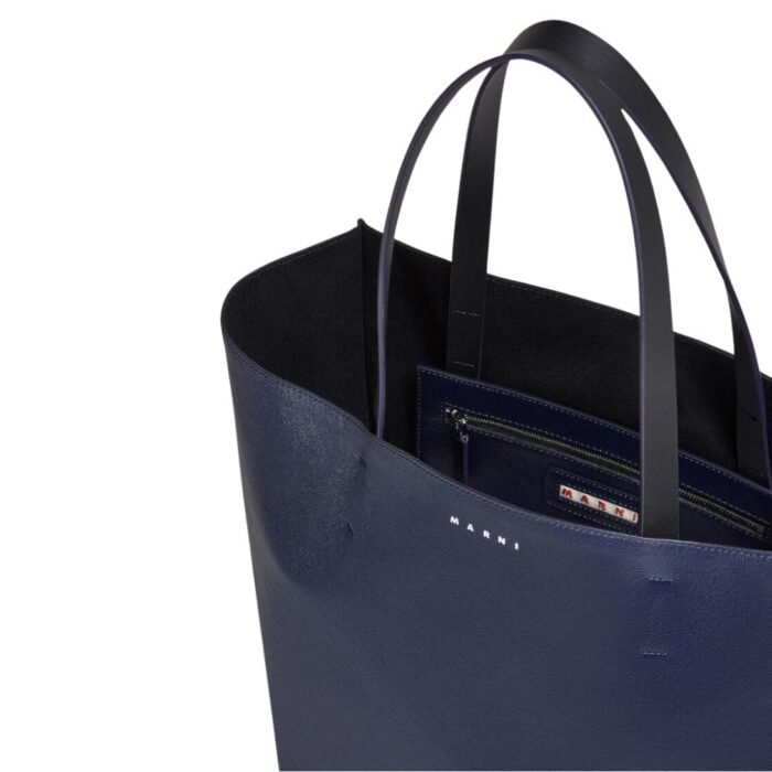 The bag’s exterior is smooth and supple, showcasing Marni’s commitment to high-quality craftsmanship. The black leather has a luxurious sheen, while the blue accents—found on the bag’s handles and strap—add a pop of color and visual interest. The handles are reinforced for durability, and the adjustable shoulder strap allows for versatile carrying options, whether you prefer to wear it crossbody or over the shoulder.