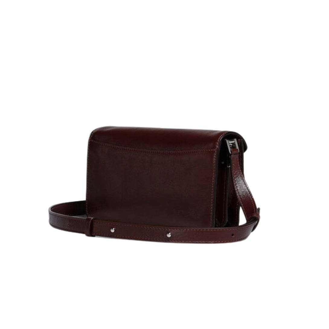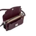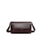 The bag’s silhouette is characterized by its rectangular, trunk-inspired shape, which offers a spacious interior while maintaining a sleek and compact profile. The supple leather exterior, meticulously crafted, provides a luxurious feel and durability. This piece features a flap closure with a distinctive clasp, ensuring both security and ease of access to your belongings. The interior is thoughtfully designed, with a lined compartment that comfortably fits your essentials and an additional slip pocket for smaller items.