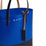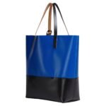 The Marni Tribeca Shopping Bag in Blue and Black effortlessly combines practicality with high fashion, embodying a modern elegance that suits both casual and formal occasions. This stylish tote is crafted from premium leather, offering a sleek and durable finish. The striking color palette features a deep, midnight blue that contrasts sharply with bold, jet-black accents, creating a visually dynamic and sophisticated aesthetic.