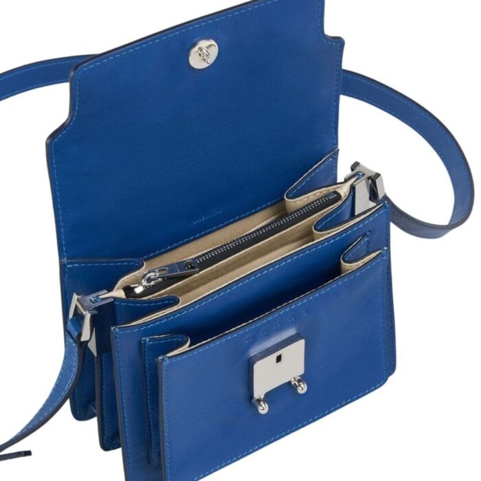 Attention to detail is evident throughout the design. The bag features subtle, gold-tone hardware that complements its rich blue leather, while the clean lines and minimalist design ensure it remains a timeless piece in your wardrobe. Marni’s signature logo is discreetly embossed on the back, adding a touch of understated branding.