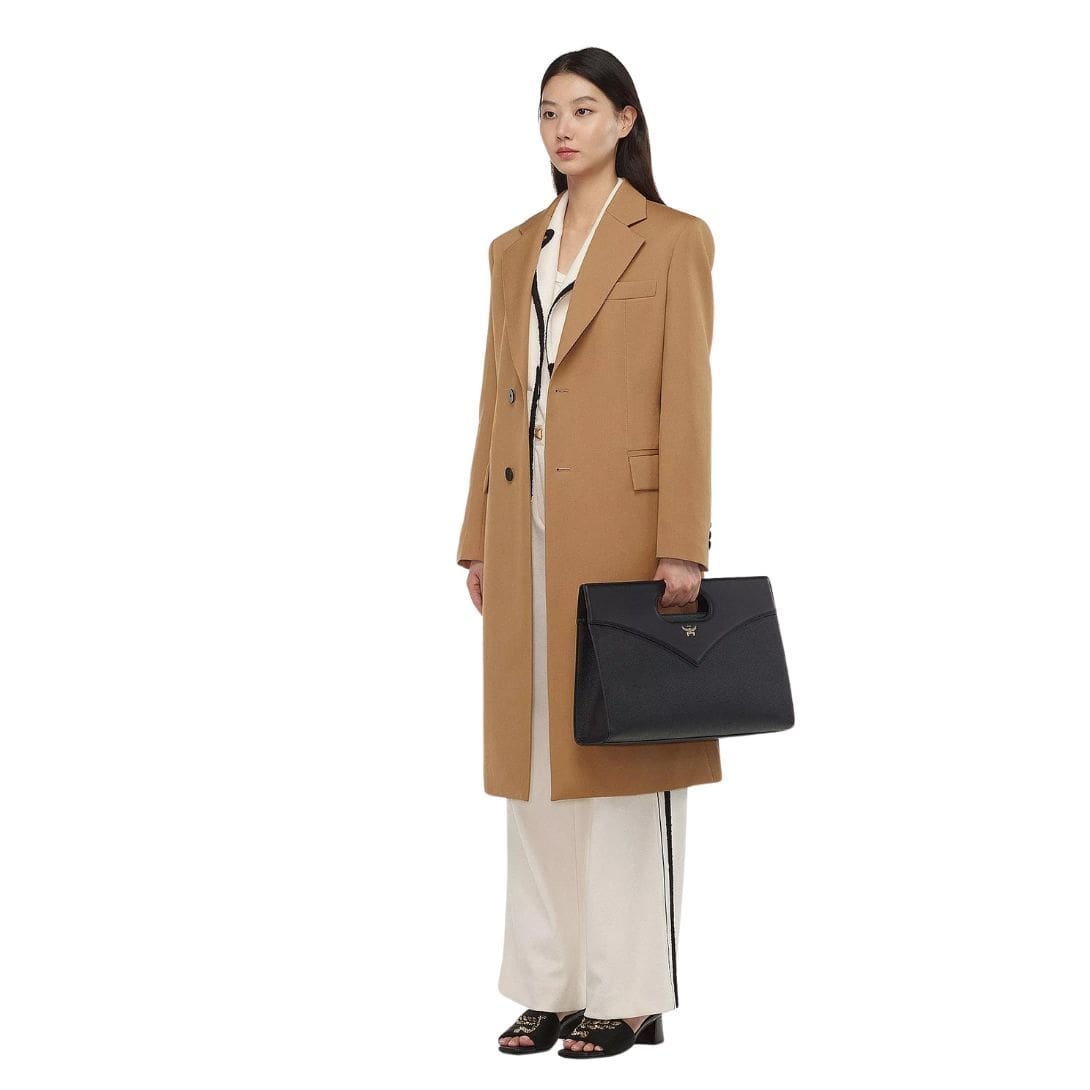 The exterior of the bag is adorned with the iconic MCM logo motif at the front, adding a touch of brand recognition and style. The trim is made from calf nappa leather, enhancing the bag’s durability and luxurious feel. The hardware is crafted from 24k gold-plated brass, offering a striking contrast to the black leather and adding a hint of opulence to the design.