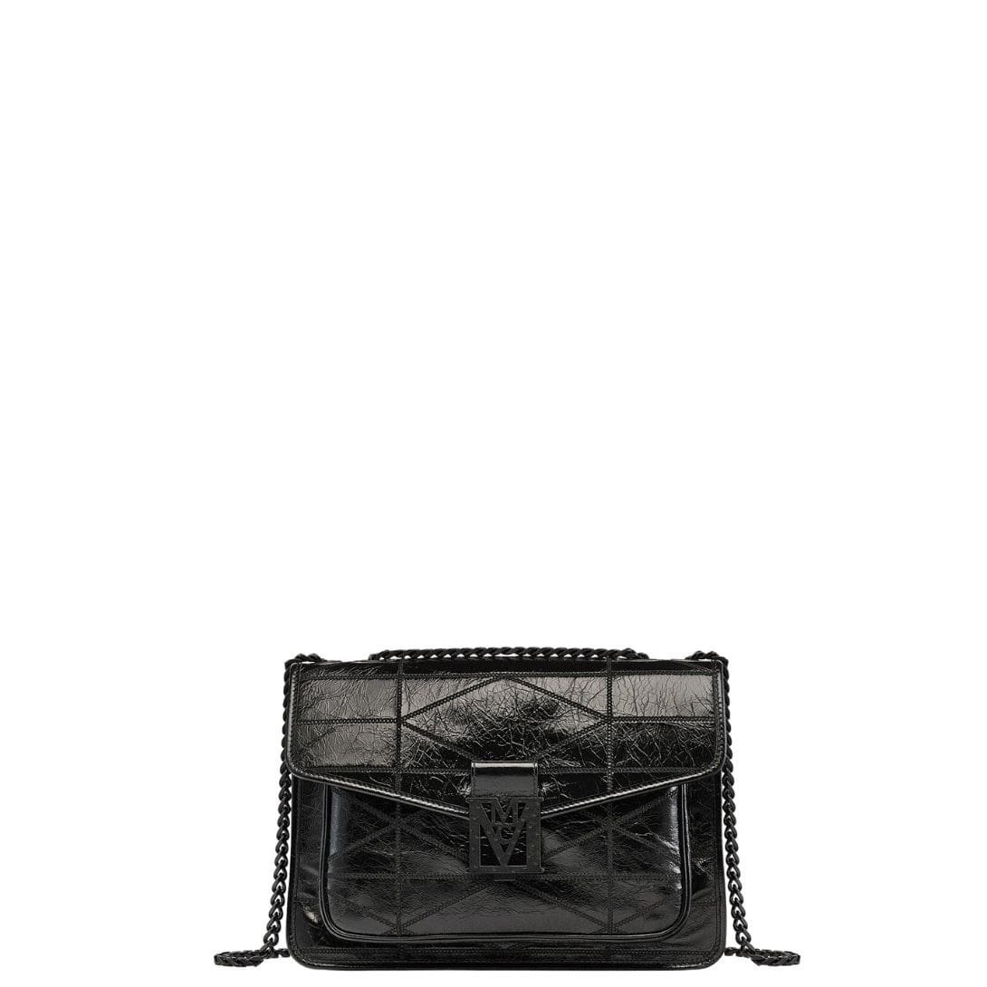 Crafted from luxurious Italian leather, the MCM Large Travia Quilted Shoulder Bag In Crushed Leather Black. exudes sophistication with a touch of edgy elegance. Dynamic geometric lines adorn the distressed surface of this spacious shoulder bag, adding a contemporary flair to its classic silhouette.