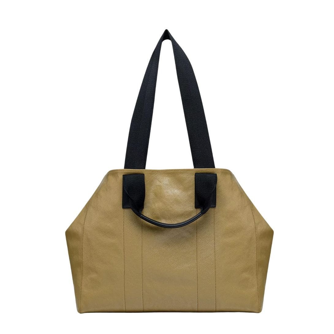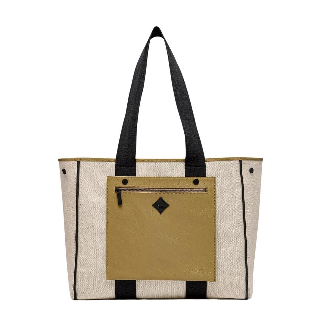 Inside, the bag is lined with a cotton-linen blend that offers a soft, protective layer for your belongings. An interior zip pocket ensures your valuables are securely stored and easily accessible. Additionally, protective leather feet on the base of the tote help maintain its structure and protect it from wear and tear when placed on various surfaces.