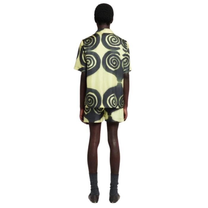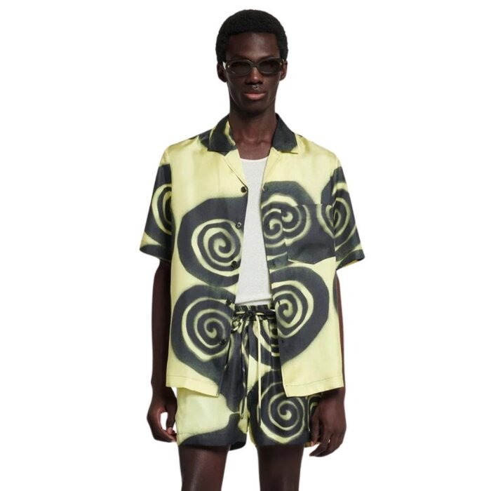 The Nanuskha Bodil Printed Silk-Twill Shirt Spiral Spray. from Nanushka is a striking example of timeless style infused with contemporary flair. This structured, short-sleeved shirt reimagines classic design elements through a modern lens, making it a versatile piece that seamlessly fits into any wardrobe. The Bodil shirt stands out with its spiral motif, a design element rich in history and symbolism. This spiral pattern draws inspiration from a Late Bronze Age plaque housed in the Hungarian National Museum, representing a symbol of circularity and continuity. This historical reference adds a layer of depth and meaning to the shirt, making it more than just a fashion item but a piece of wearable art.