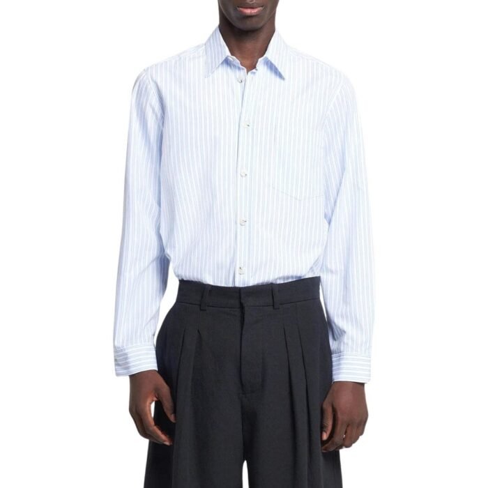 In essence, the Nanushka Kaleb Long Sleeve Striped Cotton Shirt in Blue combines classic design elements with contemporary flair to create a versatile and effortlessly stylish piece. With its relaxed fit, timeless stripes, and thoughtful details, this shirt offers a fresh interpretation of traditional menswear, perfect for the modern-day gentleman seeking refined yet understated elegance in his wardrobe.