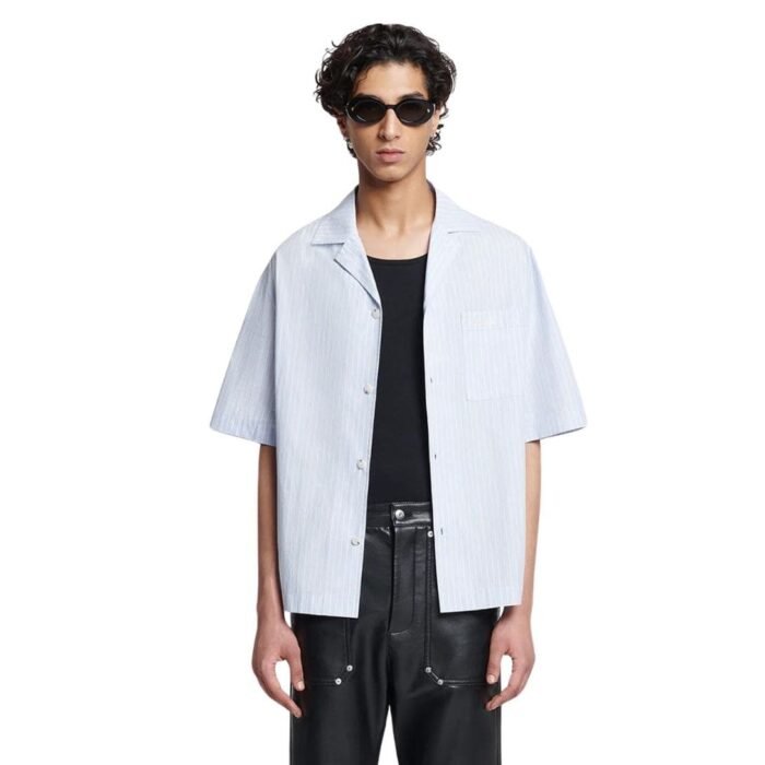 The NANUSHKA MAXTON STRIPED SHIRT BLUE seamlessly merges classic style with a modern, sporty allure. Crafted from a blend of white, beige, and blue striped cotton, it exudes a timeless charm with a contemporary twist. Its relaxed short-sleeved silhouette epitomizes laid-back sophistication, offering both comfort and versatility for various occasions.