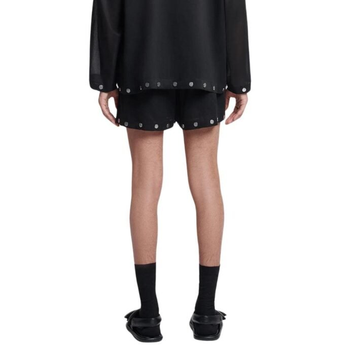 Adding to their modern allure are the silver studs detailing, which adorn the hem and cuffs of the shorts. These metallic accents add a touch of edge and attitude to the design, infusing the shorts with a sense of contemporary coolness that sets them apart from the ordinary.