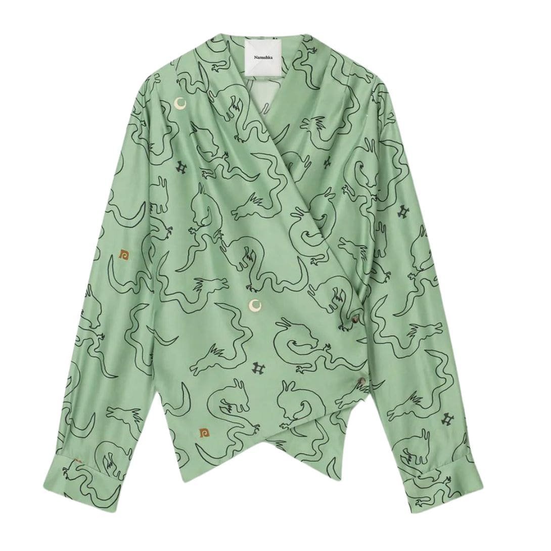 NANUSHKA CASPIAN DRAPED TWILL SILK SHIRT GREEN