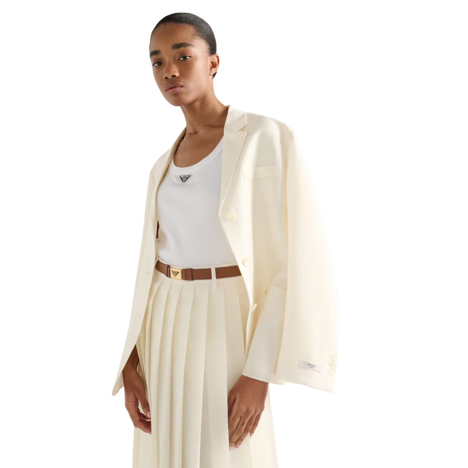 Elevate your ensemble with the refined elegance of this leather belt, where minimalist design meets timeless sophistication. With its iconic triangle logo and meticulous craftsmanship, it is sure to become a cherished addition to your collection, adding a touch of luxury to every outfit.