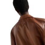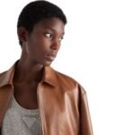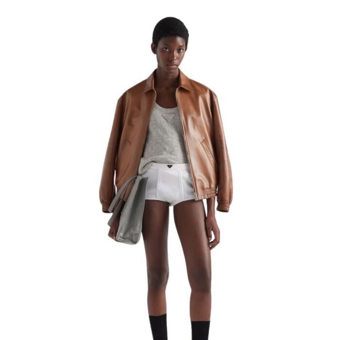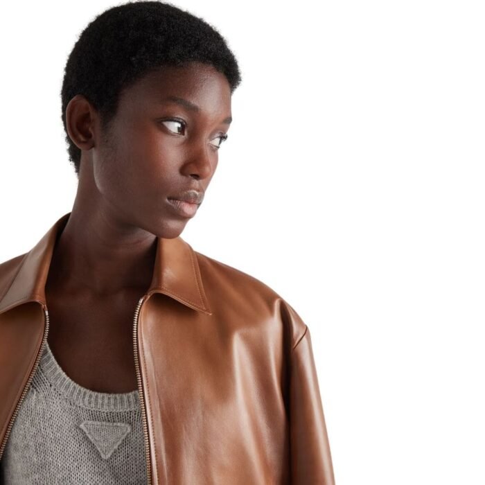 A hallmark of Prada’s attention to detail is evident in the jacket’s construction. The Nappa leather is meticulously selected for its high quality, ensuring durability and a luxurious feel. The jacket is equipped with a sturdy, concealed zip closure that blends seamlessly with the overall design, maintaining a minimalist and refined look. Additionally, the interior is lined with a smooth fabric that enhances comfort and ease of wear.