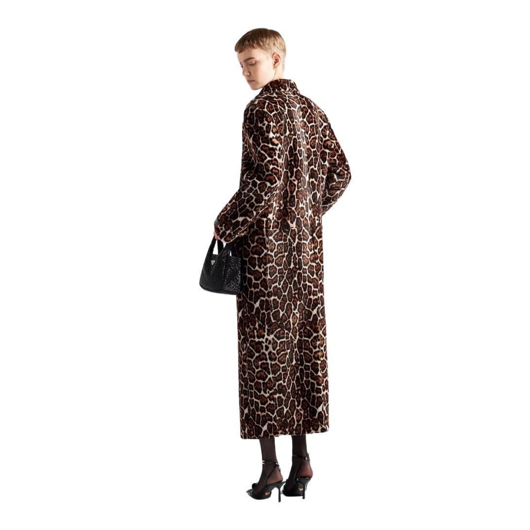 At first glance, the coat captivates with its striking print, a hallmark of Prada’s daring approach to design. The intricate pattern combines modern aesthetics with a nod to traditional motifs, creating a visually engaging piece that stands out in any setting. The print is meticulously applied, ensuring that each coat is a unique masterpiece.
