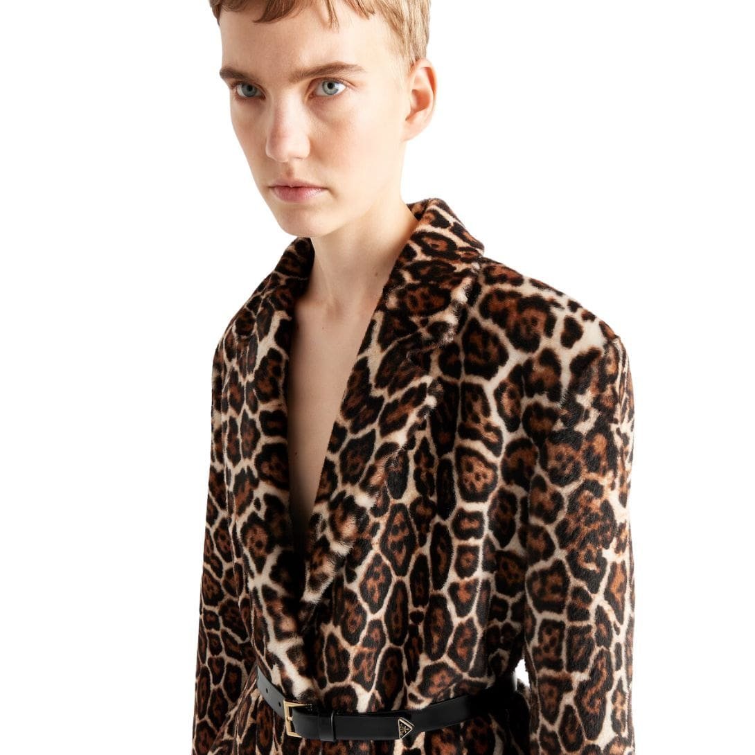 In summary, the Prada Printed Sheepskin Coat is a luxurious garment that combines the brand’s avant-garde design philosophy with exceptional craftsmanship. It is a statement piece that provides both functionality and high fashion, perfect for those who seek to make a bold yet sophisticated impression.