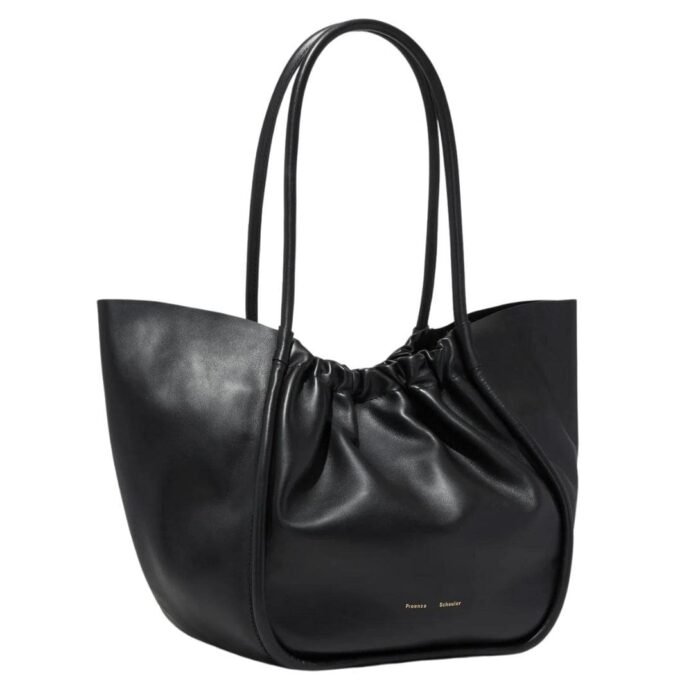 Step into the realm of timeless sophistication with the Proenza Large Ruched Tote Black, meticulously crafted to embody a soft, unstructured silhouette that exudes effortless elegance. Its design is a seamless fusion of form and function, featuring a ruched top adorned with the signature gold-tone logo stamp, a symbol of exquisite craftsmanship and attention to detail.