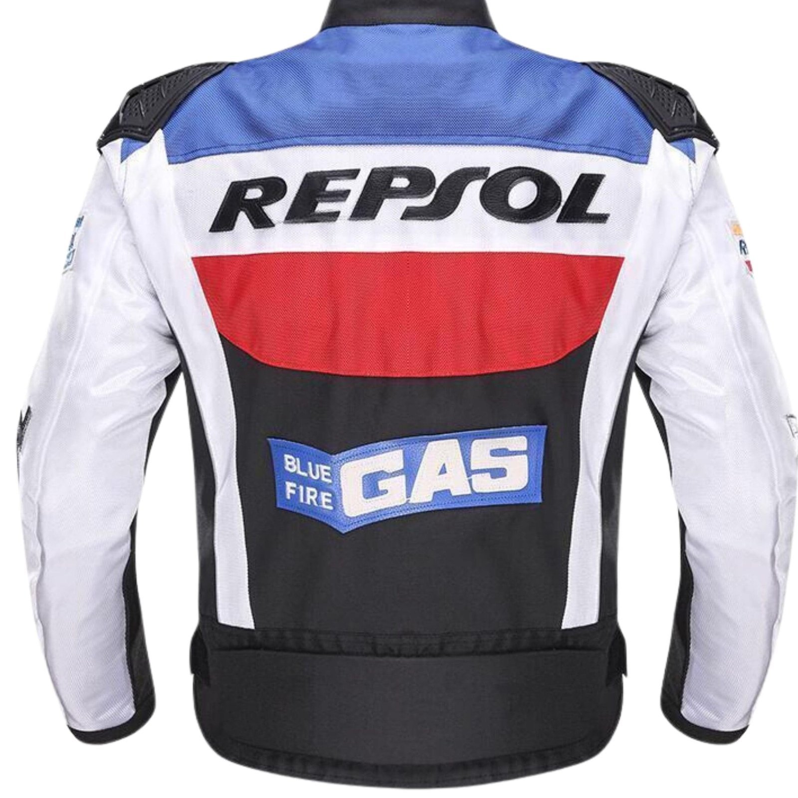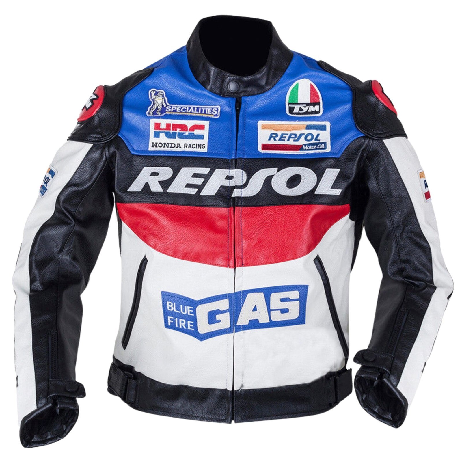 Equipped with CE-approved armor inserts on the shoulders, elbows, and back, this jacket ensures maximum safety without compromising on flexibility or comfort. Its ergonomic design and adjustable fit guarantee freedom of movement, allowing riders to tackle every twist and turn with confidence. Whether you’re tearing up the track or cruising the streets, the Repsol Blue Fire Gas Motorbike Rider’s Racing Leather Jacket is your ultimate companion, embodying the spirit of speed and adventure with every ride.
