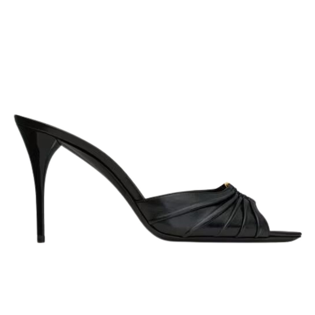 These stiletto mules feature a pointed peep toe and a gathered upper for a modern and elegant look. The design is accentuated with the iconic CASSANDRE detail in bronze-tone metal, adding a signature touch of sophistication.
