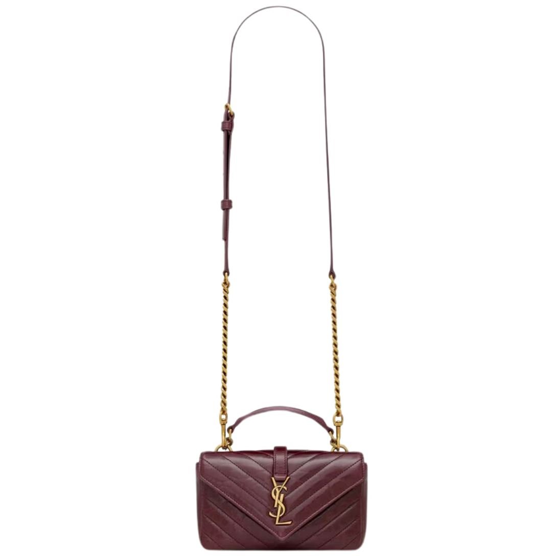 The Mini College Bag is a sophisticated and compact accessory adorned with chevron-quilted overstitching and the iconic Cassandre. Perfect for day-to-night styling, this versatile bag features a top handle and a detachable leather-and-chain strap, allowing for dual carrying options.