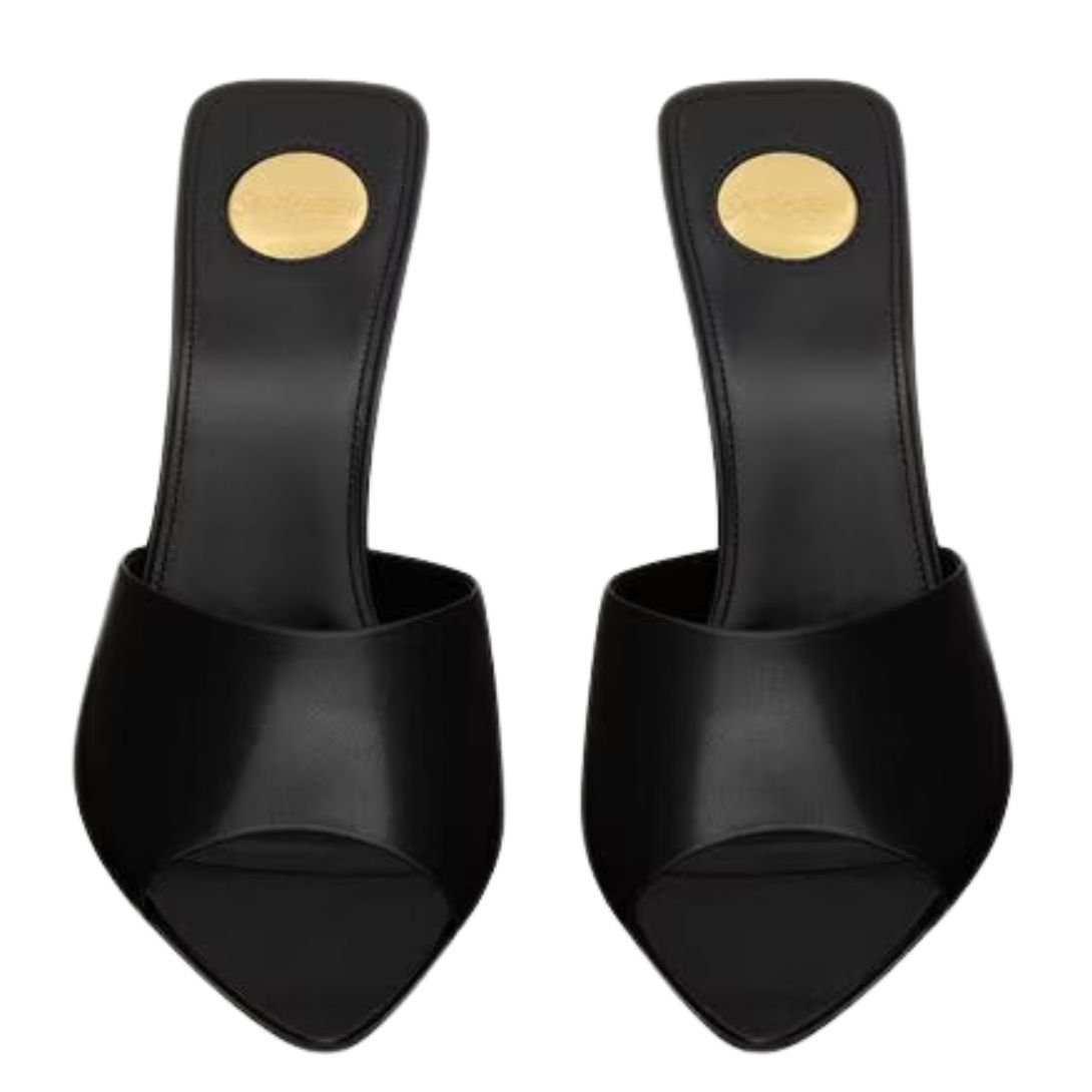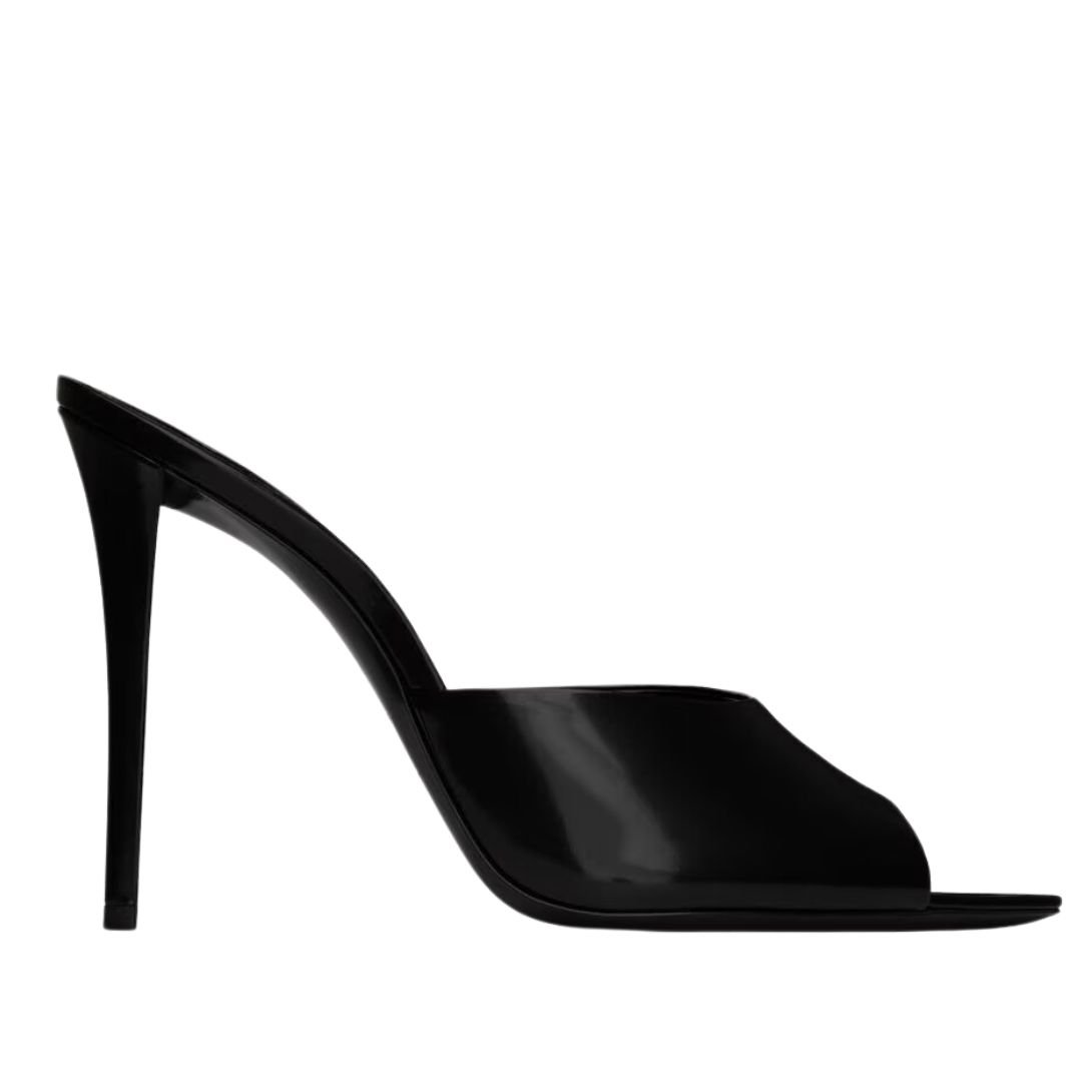 These stiletto mules feature a pointed almond peep toe and a thick arch band for a clean and sophisticated look. The minimalist style is complemented by a round Saint Laurent-engraved metal plaque on the insole, adding a touch of luxury to the design.
