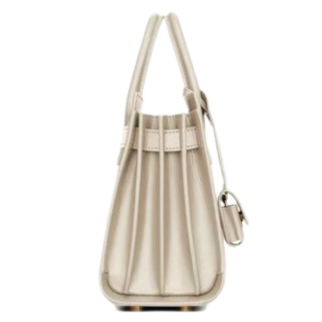 The Nano Sac de Jour Bag is a compact yet luxurious piece that combines elegance with functionality. Crafted from calfskin leather and lined in leather, this bag is designed for those who appreciate both style and practicality. It is easily recognizable by its accordion sides, snap tabs, and signature brass padlock.