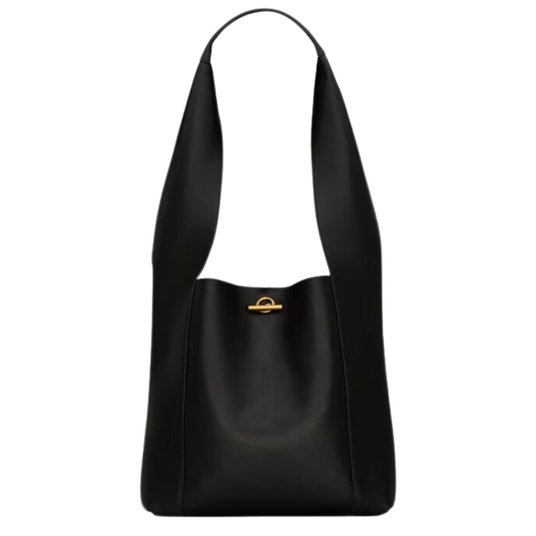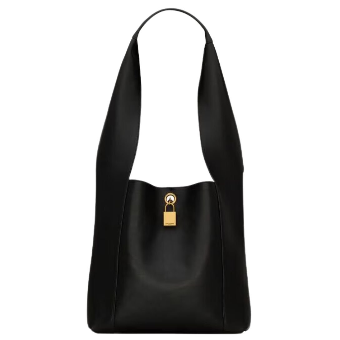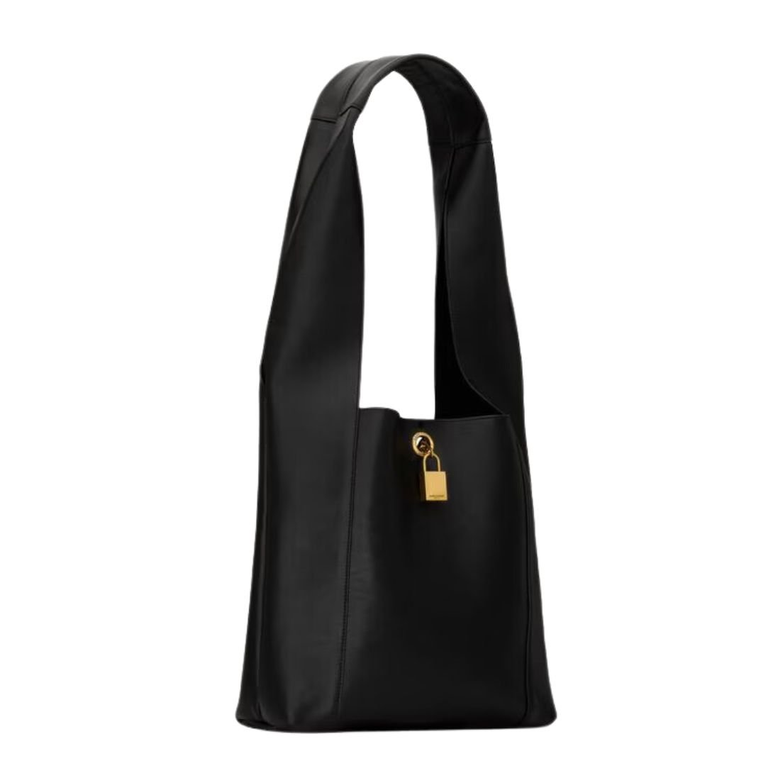 The Supple Hobo Bag exudes effortless elegance with its minimalist design and luxurious materials. Crafted from calfskin leather, this bag is both stylish and functional. It features a toggle closure adorned with a SAINT LAURENT PARIS-engraved padlock, offering a unique and sophisticated touch.
