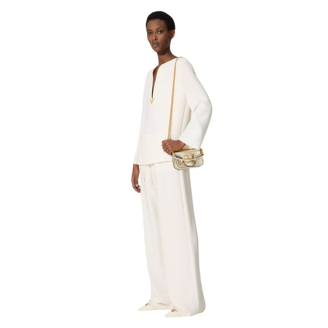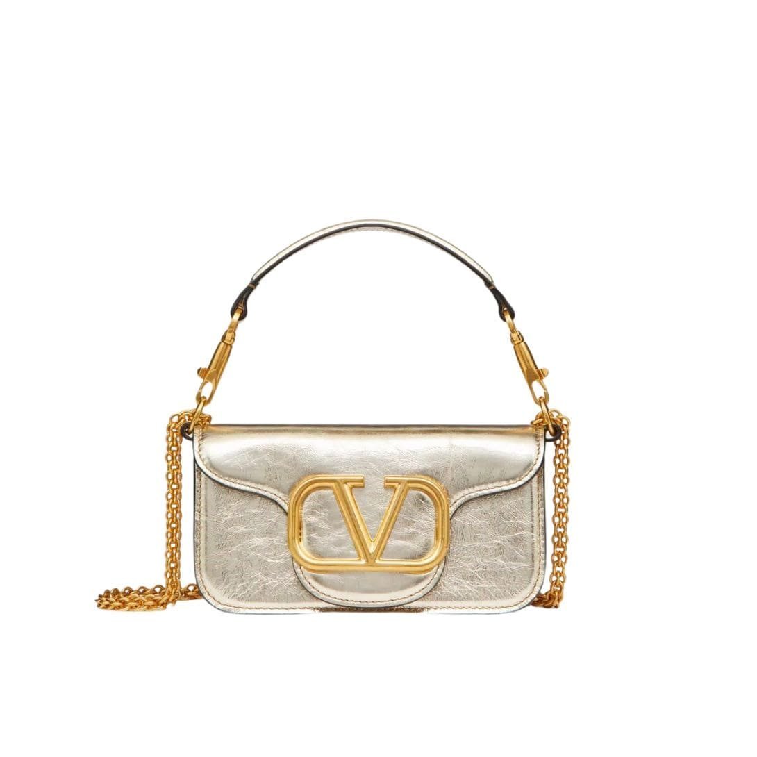 Introducing the small valentino garavani Locò metallic calfskin shoulder bag by Valentino Garavani, crafted from craquelé-effect metallic calfskin leather and adorned with the iconic VLogo Signature element. This sophisticated accessory is designed for versatility, featuring a detachable sliding chain strap and a removable handle, allowing it to be worn as a crossbody, shoulder bag, or handbag.