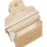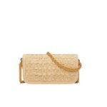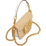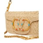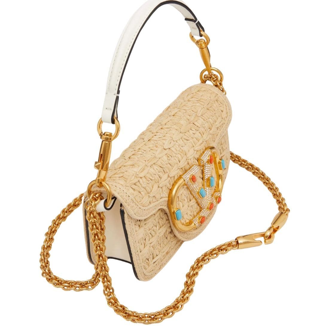 Crafted in Italy, the small Valentino Garavani Locò raffia shoulder bag with jewel logo boasts an exquisite design, blending woven synthetic raffia with the iconic VLogo Signature jewel element. Its versatility is unmatched, featuring a detachable sliding chain strap and a removable handle, allowing it to seamlessly transition from a crossbody to a handbag.