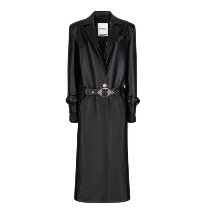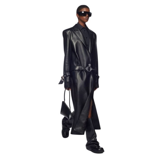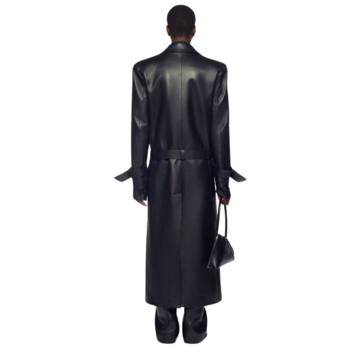 The attico black long coat in leather features sleeves that reveal a black jacquard logo lining, a belt at the waist and sleeves, logo metal buckles, and a logo metal button. Made in Romania.