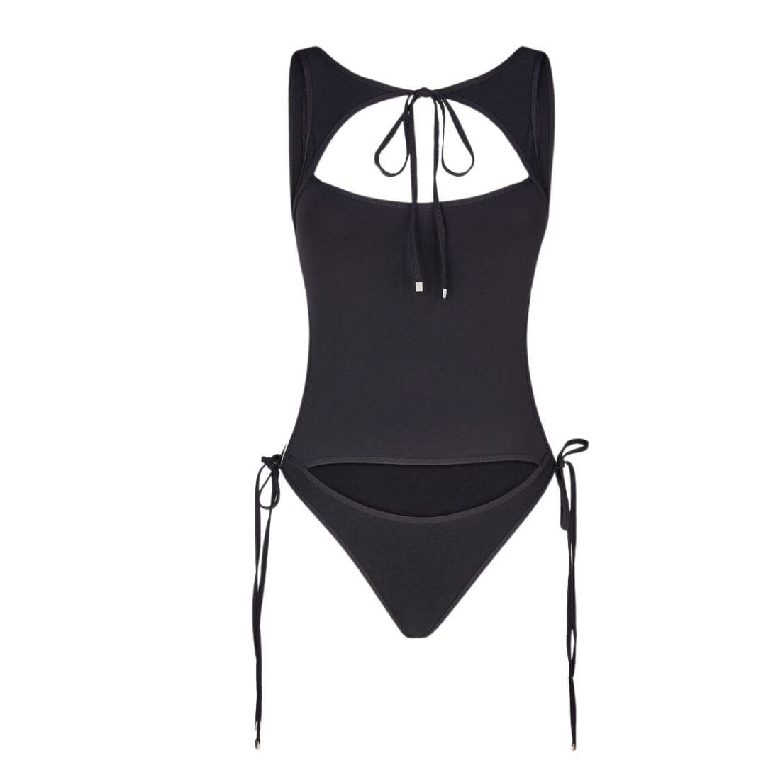 The Attico Black One Piece in Black Light Net with Cut-Out and Logo Metal Ends – Made in Italy