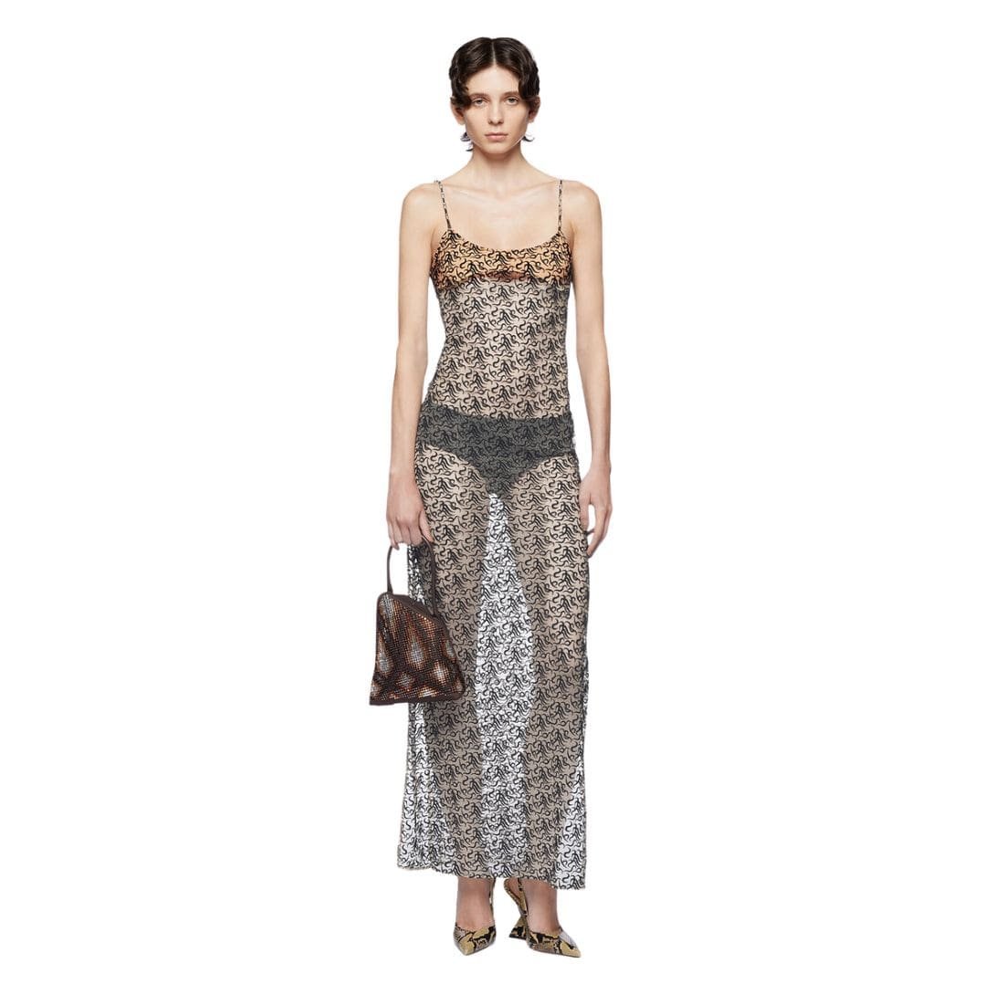 The Attico Champagne and Black Long Dress in champagne and black tribal logo embroidered tulle with a deep back neckline, chain shoulder straps, and logo metal adjusters. Made in Italy.
