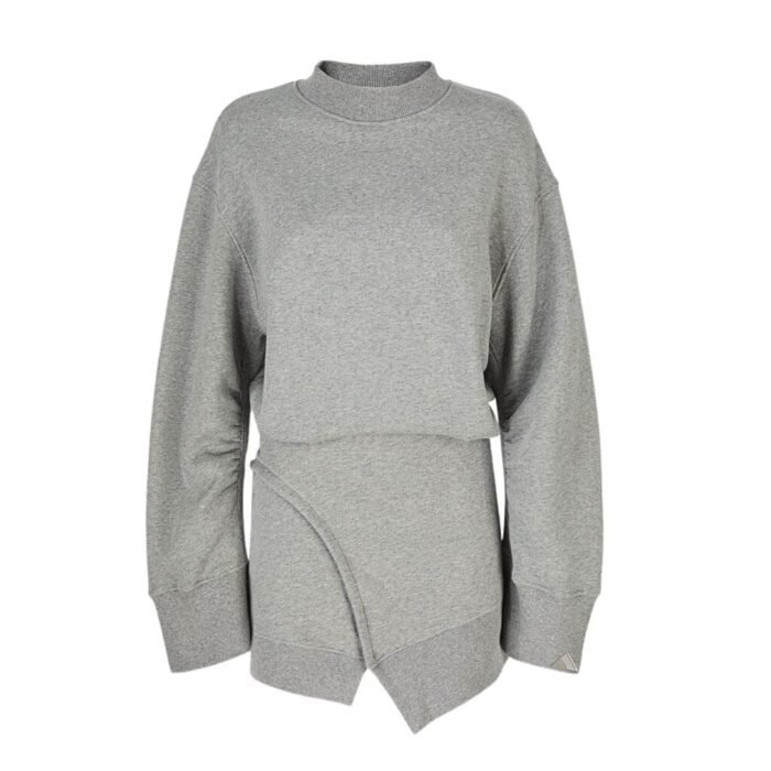 The Attico ”Ivory” Melange Grey Mini Dress in melange grey gauzed fleece with asymmetrical bottom and logo metal stud. Made in Portugal.