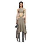 The Attico “Magnolia” Military Long Dress in military shiny lycra with logo metal hook.