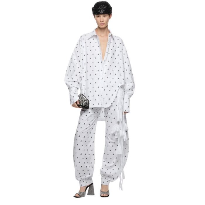 The Attico Rey Black and white Long pants in white parachute canvas featuring a black all-over logo and wide legs. Made in Italy.